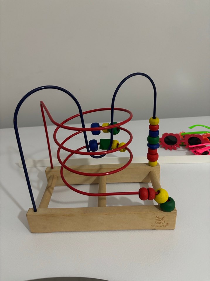 Renkli boncuklu spiral ve düz hatlar içeren ahşap eğitim oyuncağı, çocukların el-göz koordinasyonunu geliştirir.