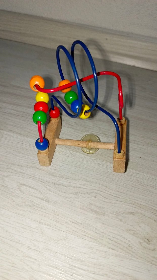 Çocukların ince motor becerilerini geliştirmesi için renkli boncukların kıvrımlı tellerde hareket ettiği ahşap eğitim oyuncağı.