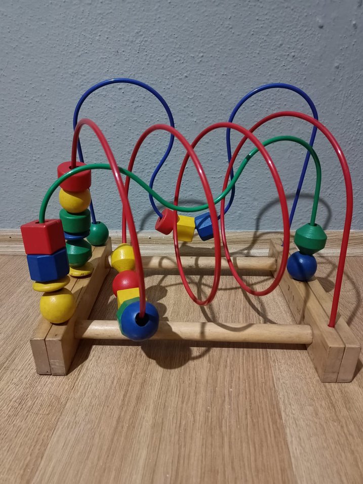 Renkli ahşap eğitim oyuncağı, çeşitli şekilli boncuklarla ince motor becerilerini ve el-göz koordinasyonunu geliştirir.