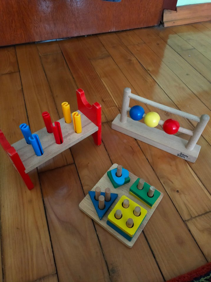 Motor becerilerini ve renk tanımayı geliştiren renkli ahşap eğitim oyuncakları seti. Çivili tahtalar, şekil yerleştirme ve top parkuru içerir.