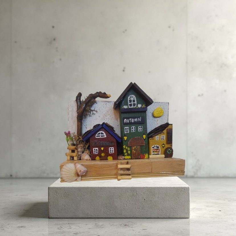 Renkli küçük evler ve ağaç figürlü, "AUTUMN" yazılı ahşap dekorasyon ürünü.