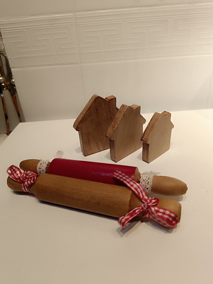 Renkli ahşap ev şeklinde üç blok ve kırmızı desenli kurdele ile bağlanmış iki merdane içeren oyuncak seti. Basit ve şirin bir oyun seti.