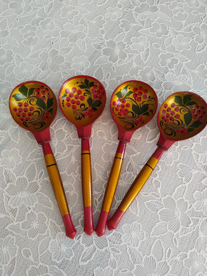 Dört parçalı, canlı kırmızı, sarı ve yeşil renklerde geleneksel çiçek desenli renkli ahşap kaşık seti.