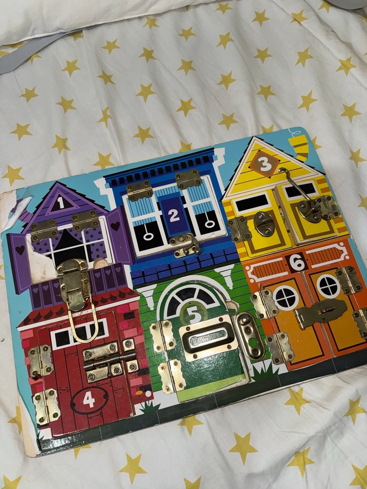 Altı numaralı renkli ahşap evler, farklı kilit ve mandallarla çocukların ince motor becerilerini ve problem çözme yeteneklerini geliştirir. 5 numaranın zinciri kopmuş durumda bir kaç yerindede soyulma var