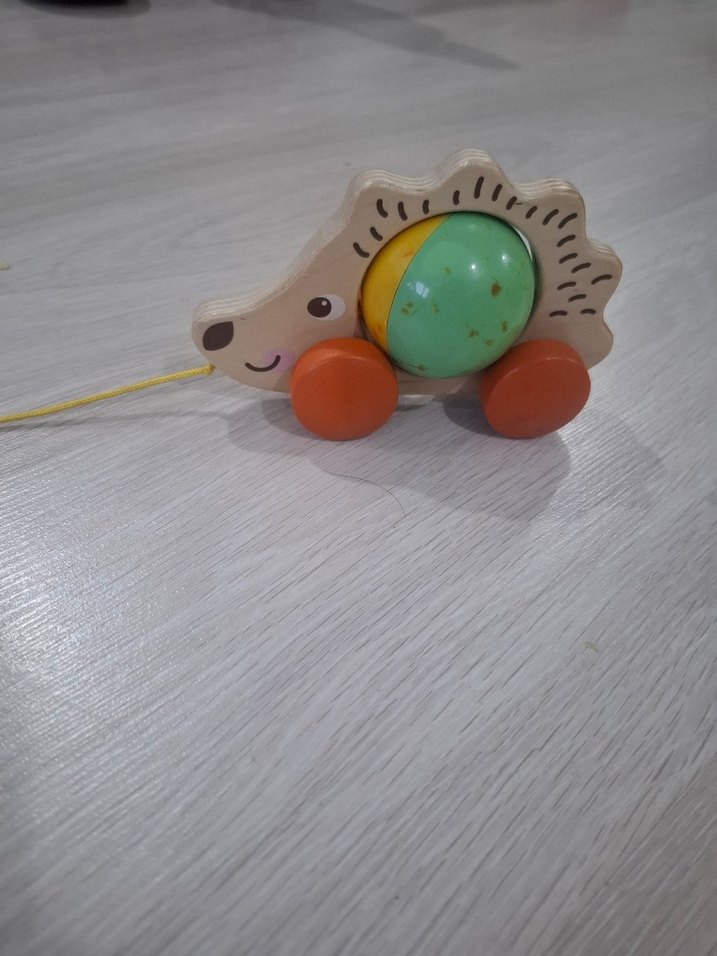 Renkli ahşap kirpi şeklinde çekçek oyuncak, turuncu tekerlekler ve yeşil gövdeye sahiptir. Çocuklar için çekilerek oynanabilir.