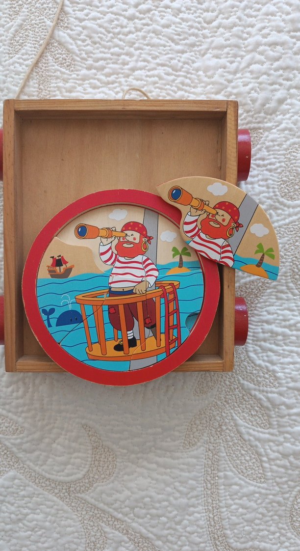 Renkli ahşap korsan temalı çocuk puzzle'ı, dürbünle bakan korsan figürü içerir. Ahşap tekerli kutu da var