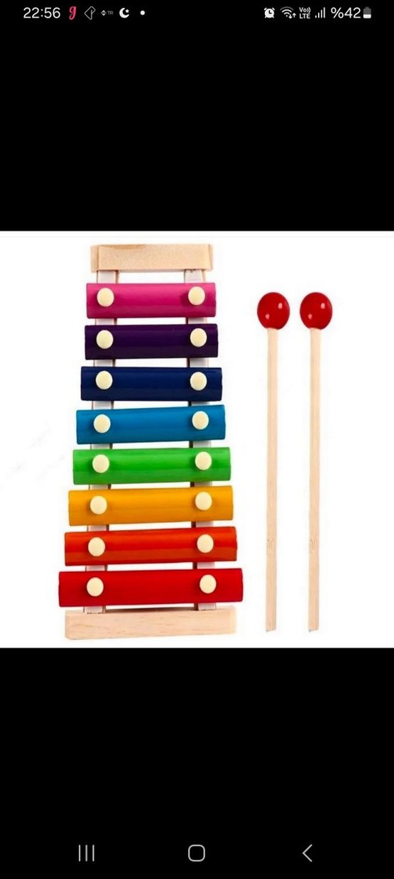 Birçok canlı renkli çubukları olan ahşap ksilofon müzik oyuncağı, çalmak için iki tokmak ile birlikte gelir.