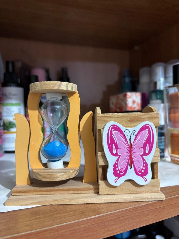 Renkli Ahşap Kum Saati ve Kelebek Figürlü Kalemlik