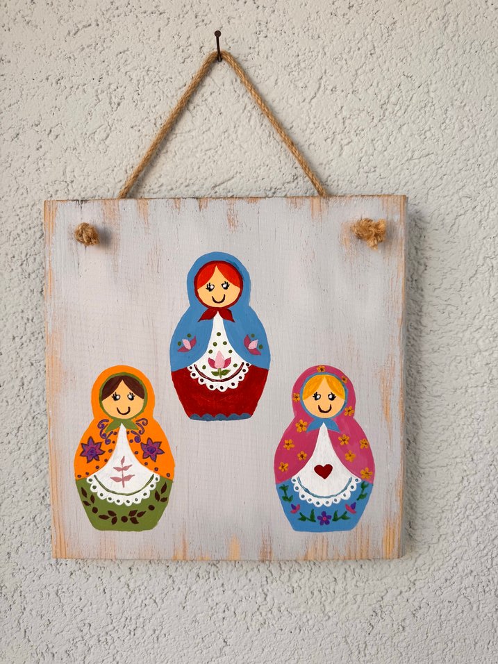 Renkli Matruşka figürlü, ip askılı ahşap duvar dekoru. Canlı ve neşeli tasarım. Kendi el emeğim . 25*25 cm