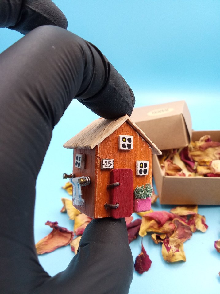 Detaylı pencereler, kapı ve küçük süslemeleri olan renkli kahverengi mini ahşap ev figürü. Önünde "25" numarası bulunur.
