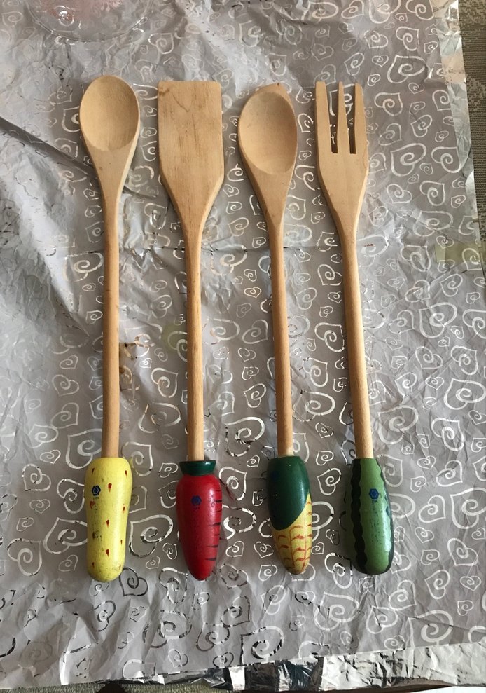 Renkli boyalı saplara sahip ahşap mutfak kaşıkları ve çatallar seti, farklı tasarımlarla.