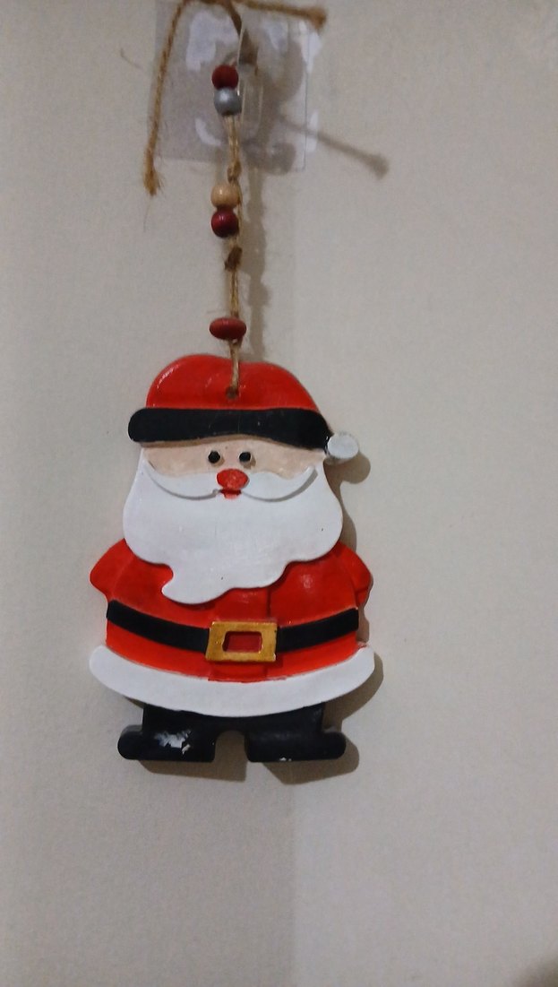 Kırmızı kıyafetli, siyah botlu renkli ahşap Noel Baba figürlü asma süs.