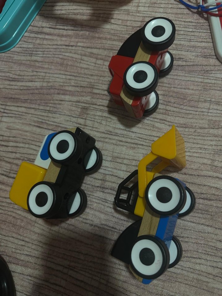 Büyük beyaz tekerlekli kırmızı, sarı, mavi ve siyah renkli üç ahşap oyuncak araba.