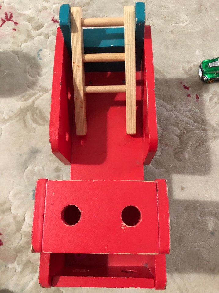 Canlı kırmızı renkte, küçük merdivenli renkli ahşap oyuncak. Doğal ahşaptan yapılmış, pürüzsüz yüzeyli.