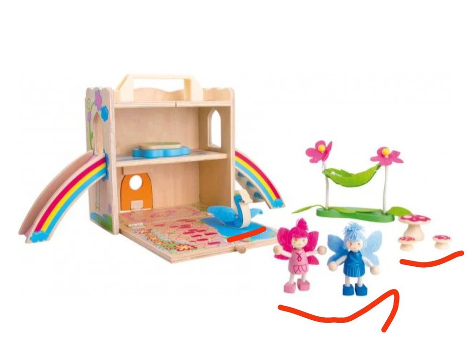 Renkli ahşap oyuncak seti, küçük ev, gökkuşağı, çiçek ve . Hayal gücünü destekler. altı kırmızı çizgili olanlar yok . bizim çok severek hiç sıkılmadan oynadığımız bir oyuncakti her yere tasiyorduk . küçük uyuncak ve bebeklerle istediği oyunu kuruyorlardi kızım ve oglum