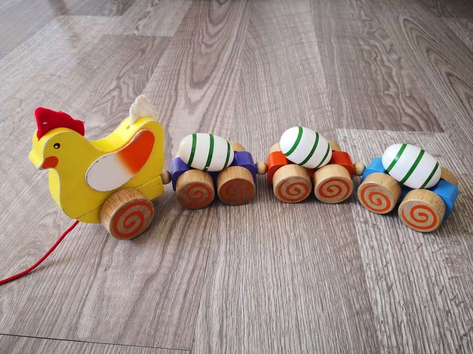 Renkli ahşap oyuncak yumurta tren seti. Doğal ahşaptan yapılmıştır. Yeni yürümeyi öğrenen çocuklar için çok zevkli ve eğlenceli bir oyuncak. Sürdükçe üzerindeki yumurtalar takla atıyor. Küçük çocuklar çok gülüyor. Temiz ve sağlam durumda. Marka temsilidir. #oyuncak #ahşap #ağaç #tavuk #yumurta #çocuk #bebek #yürüteç