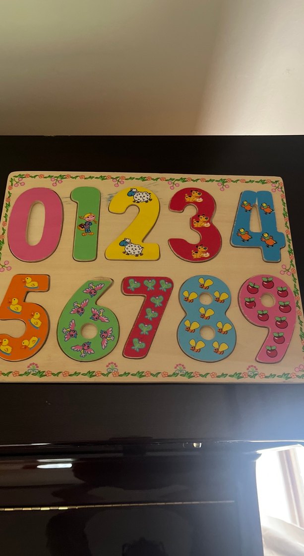 0'dan 9'a kadar hayvan ve böcek figürlü, renkli ahşap sayı bulmaca oyunu.