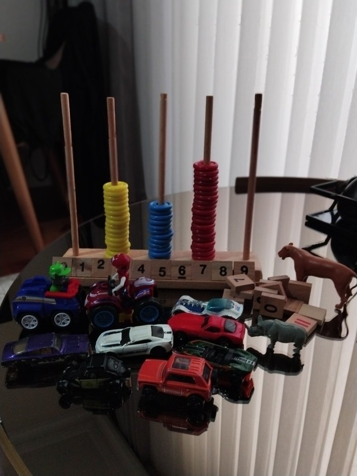 Renkli ahşap bloklar ve halkalarla sayı sayma ve aritmetik öğrenme oyuncağı. Küçük oyuncak araçlar ve hayvanlar içerir.