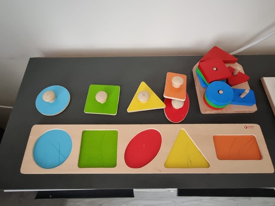 Renkli ahşap şekillerden oluşan bu eğitim oyuncağı, çocukların şekil ve renkleri öğrenmesine yardımcı olur.