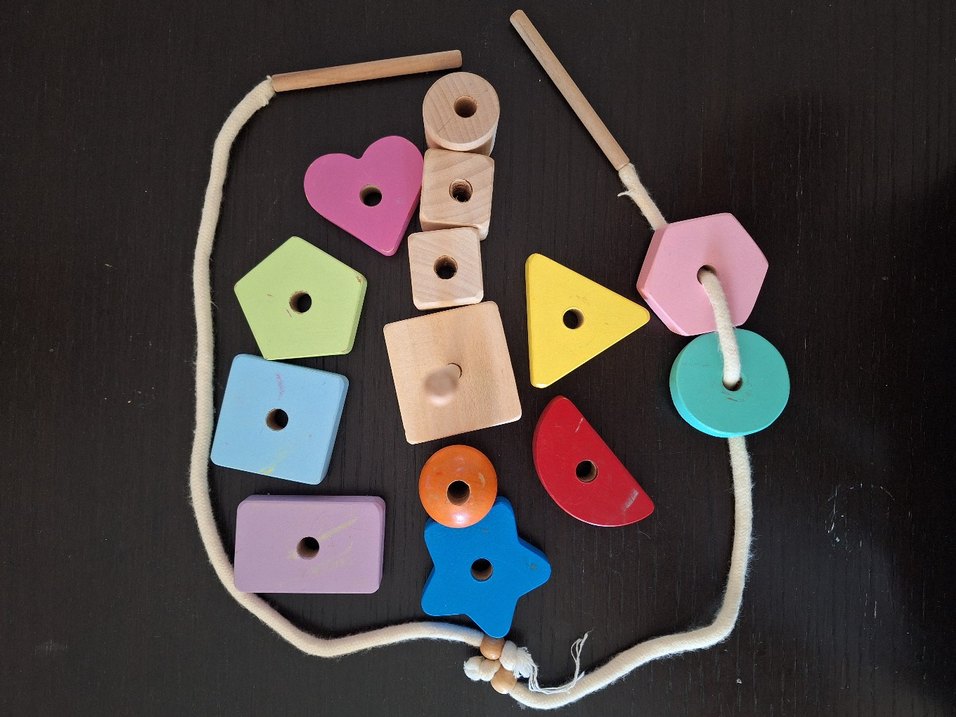 Renkli ahşap şekillerden oluşan bu eğitim oyuncağı, ip geçirme ve ince motor becerilerini geliştirme için uygundur. İp ve tahta çubuklar içerir. Muhteşem renkli ve çok sevilen bir oyuncaktır. çocuklara zararlı boya içermez. Moccotoys.com #ahşap #doğal #eğitici