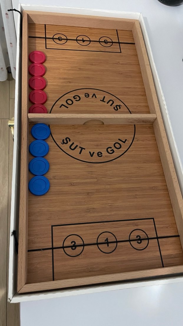 Renkli kırmızı ve mavi taşlara sahip ahşap oyun seti, üzerinde 'SUT ve GOL' yazısı bulunan tahtası ile eğlenceli bir oyun sunar.