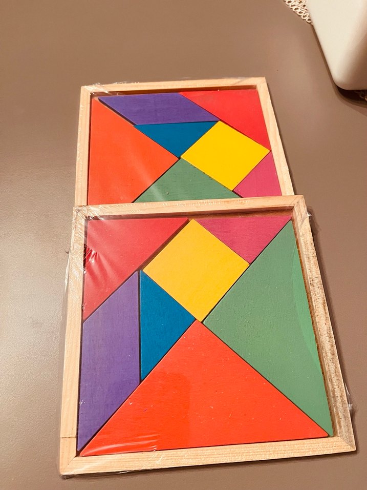 Çeşitli geometrik şekillerden oluşan renkli ahşap tangram seti. Mekansal farkındalığı ve problem çözme becerilerini geliştirir.tanesi 50 TL