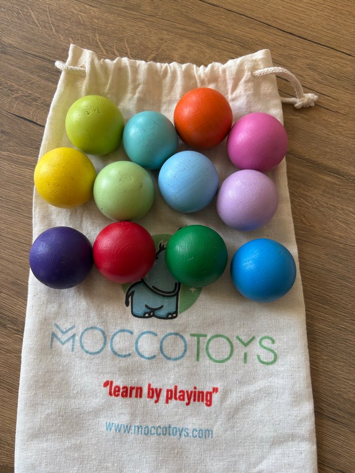 renkli ahşap toplar ve 'learn by playing' yazılı kumaş çanta seti.