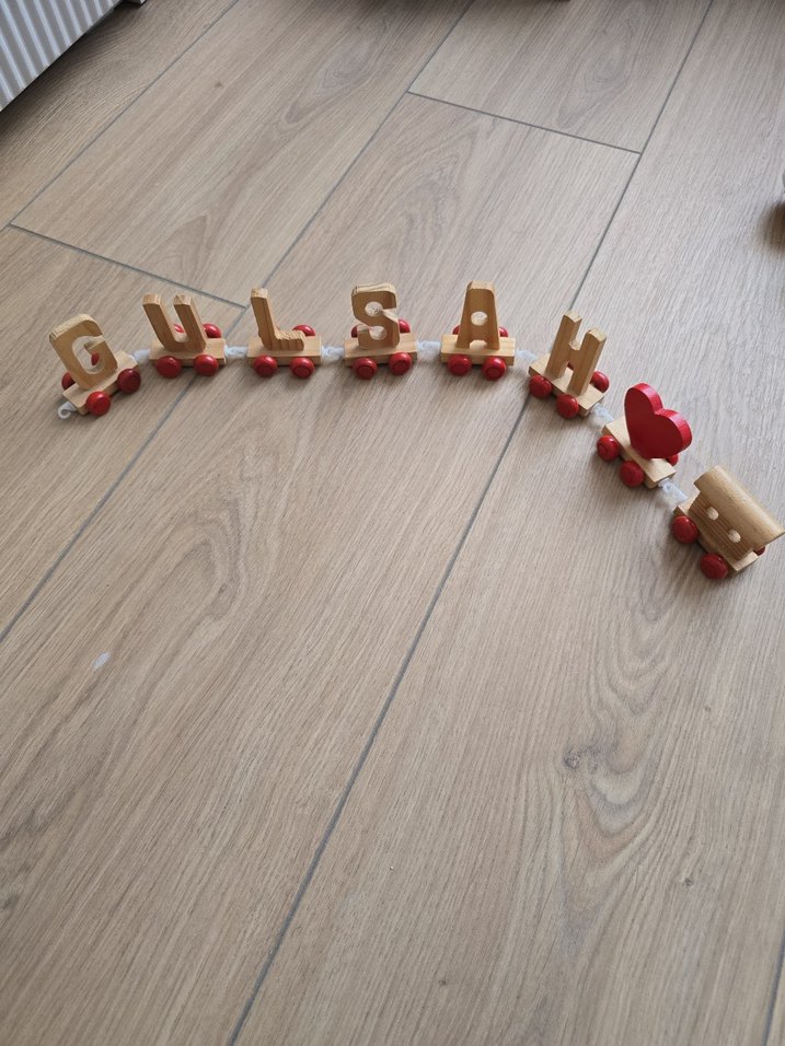 Bej harfler ve kırmızı tekerleklerle renkli ahşap tren oyuncağı, hayal gücünü destekler.