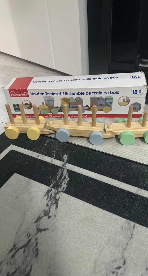 Sıfır ahşap tren. Yenidir. Üst kısımları yok sadece alt trenleri var. 18 ay ve üzeri çocuklar için çok renkli, açık renkli ahşap tren seti. Birbirine bağlı birkaç tren vagonu içerir.