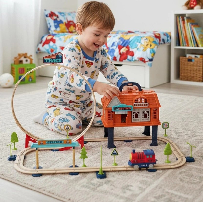 Renkli ahşap tren seti, tutma saplı istasyon ve raylar üzerinde küçük bir tren içerir. Çocukların hayal gücünü ve motor becerilerini destekler.