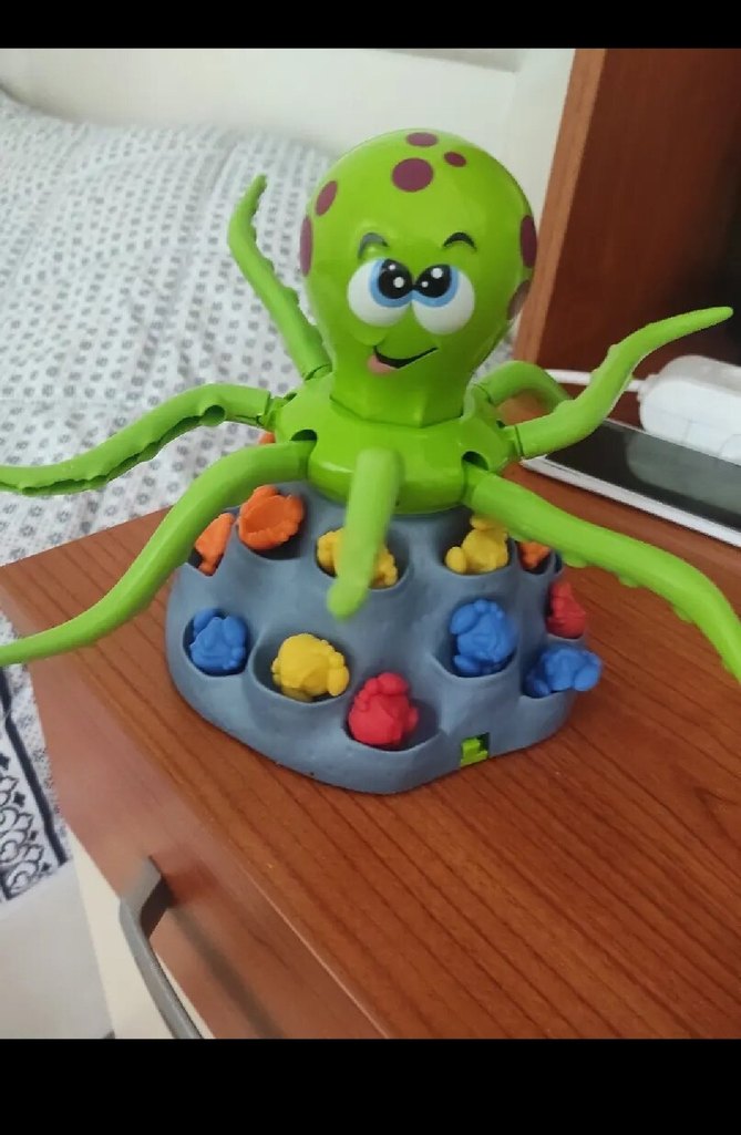 Çok renkli balık parçaları ve gri taban üzerinde yeşil ahtapot figürlü eğitici oyuncak. Çocukların etkileşimli oyun ve öğrenme deneyimi için uygundur.
