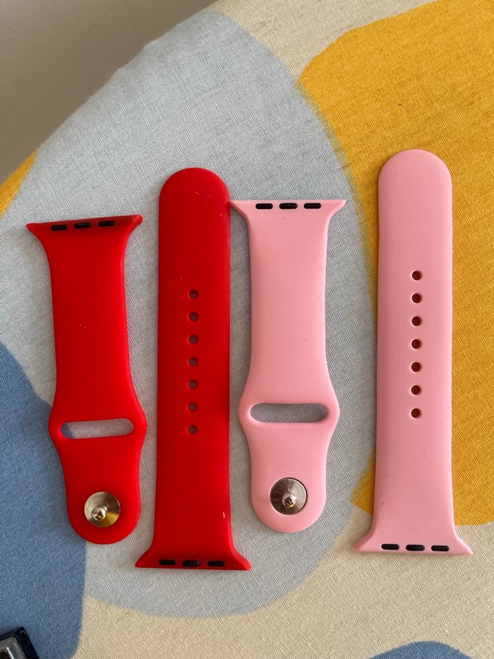 Kırmızı ve pembe tonlarda renkli silikon akıllı saat kayışları. Yumuşak ve esnek malzeme ile rahat kullanım sağlar. Farklı bilek boyutlarına uygundur.⌚