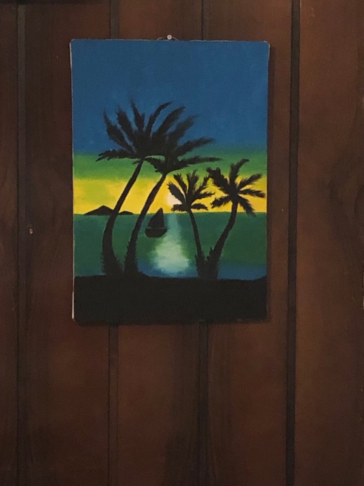 Karartılmış çok renkli bir gün batımı fonunda palmiye ağaçları ve denizde bir tekne figürü bulunan tablo.
