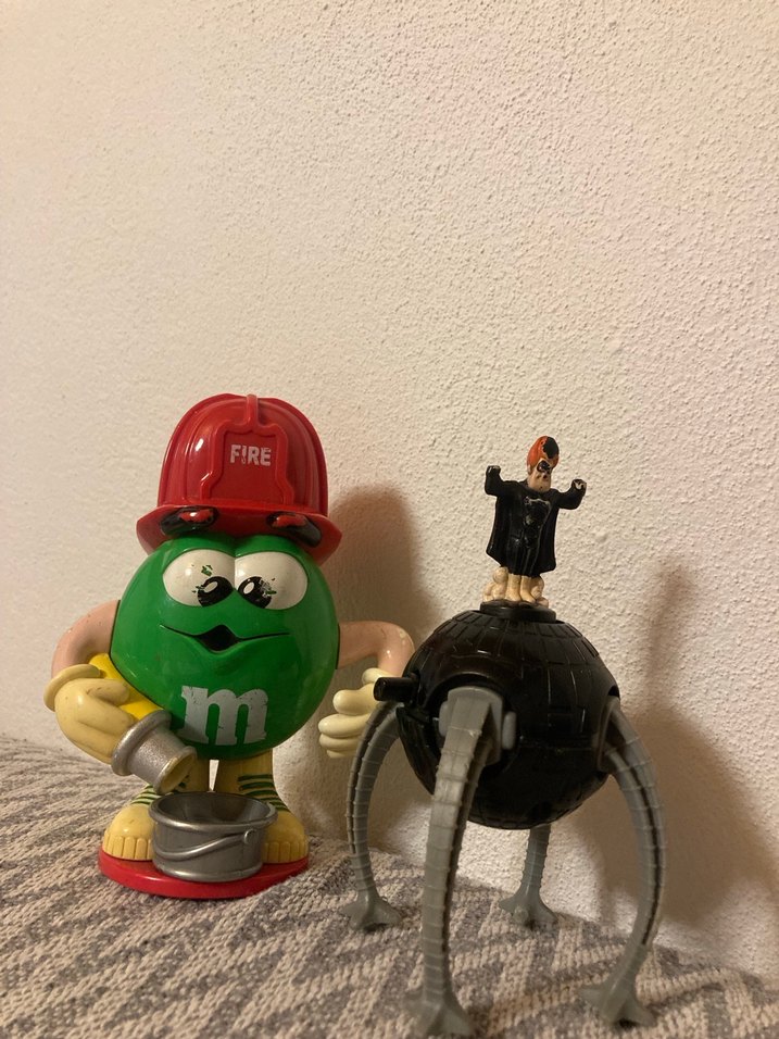 Kırmızı itfaiyeci şapkası üzerinde "FIRE" yazan yeşil karakter yukarıdaki şapkasından su koynca alta görünen kovaya su geliyor ve bacakları olan siyah küre üzerinde küçük figür içeren renkli aksiyon figür yandan çevrilen düğmesiyle hareket ediyor .ikisi bir satılmaktadır