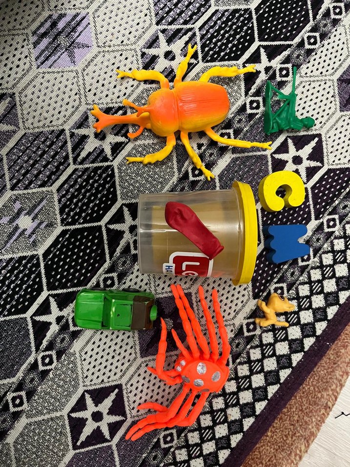 Sarı-turuncu böcek, kırmızı örümcek, yeşil araç ve çeşitli küçük aksesuarlar içeren renkli aksiyon figürleri seti. Kırmızı balonlu bir kap da dahil.