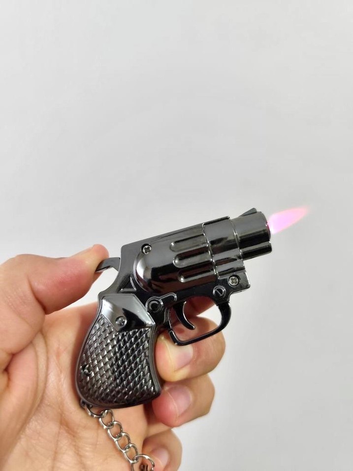 Siyah Çakmak tabanca, tetiklendiğinde renkli alev efekti verir ve küçük boyutlu, anahtarlık aparatlıdır.