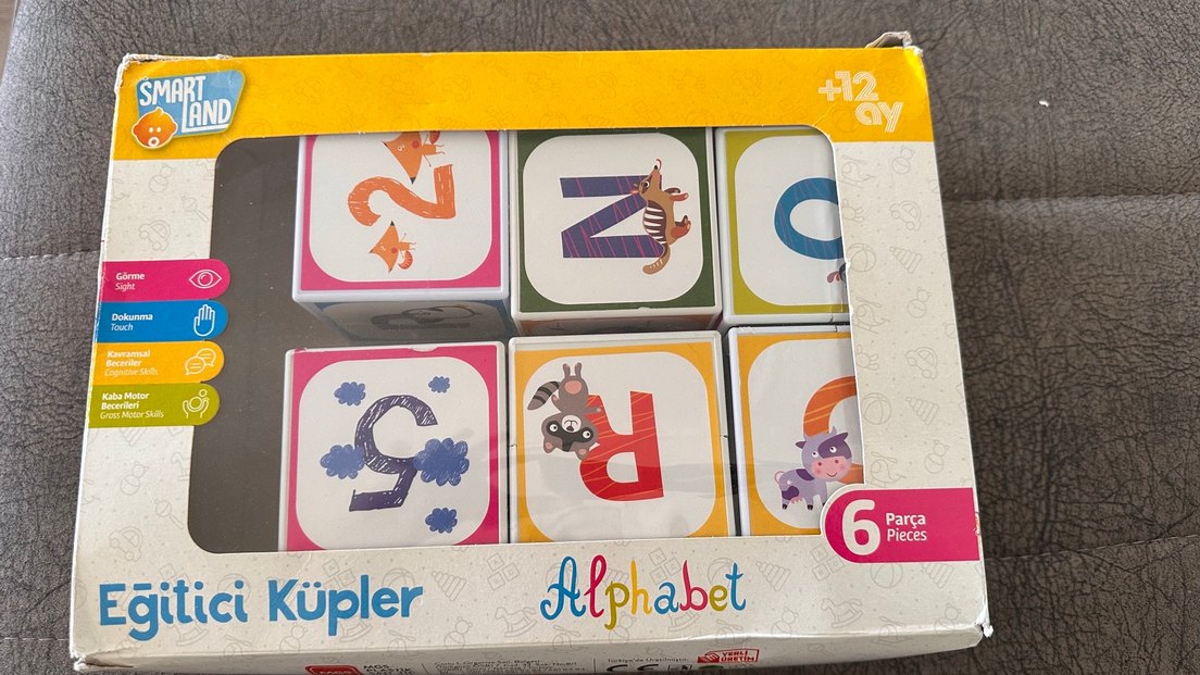 Renkli alfabe harfleri ve hayvan resimleri içeren eğitim blokları, erken öğrenimi destekler. Eğitici Küpler: 6 parça +12 ay. hiç kullanılmadı. Taşınmadan kaynaklı kutusu zarar görmüş küplerde hiçbir kırık falan yok.