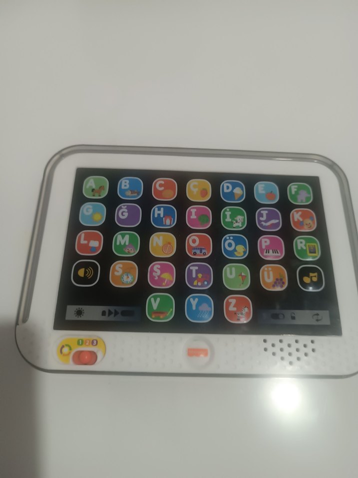 Çocukların harfleri ve sesleri öğrenmesi için ışıklı alfabe düğmelerine sahip renkli eğitim oyuncağıdır. Ses ve ışık kontrolleri içerir.