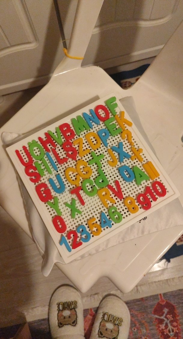 Delikli tahtada renkli manyetik harfler ve sayılar bulunan öğrenme amaçlı eğitici oyuncak.