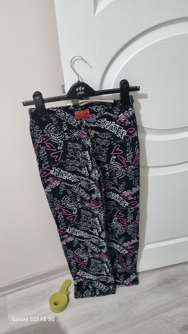 Siyah sentetik kumaş üzerine renkli baskılı, elastik bel bantlı, dar kesim tek alt Sokak modası ve rock punk tarzı yansıtıyor.