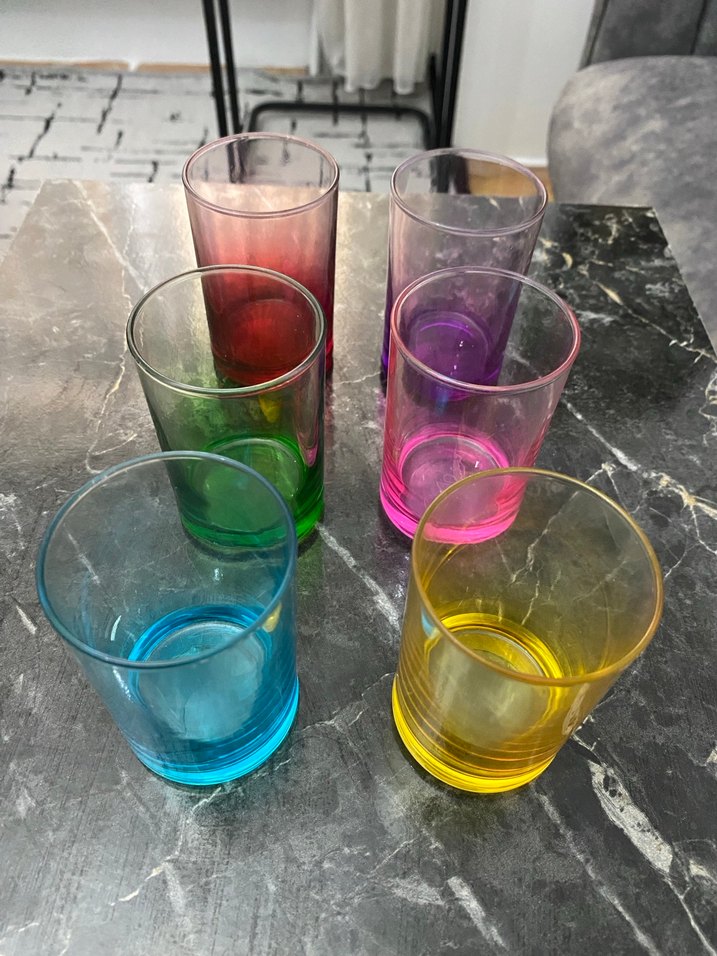 Altı adet farklı canlı renkte, sade ve şık cam bardak seti. Günlük kullanıma uygun, pürüzsüz tasarıma sahip.