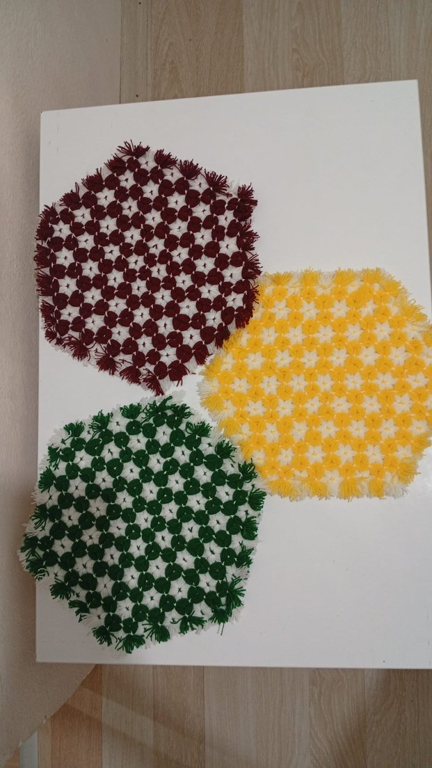 Yeşil, sarı ve bordo renklerde altıgen şekilli renkli banyo süngerleri seti, nazik temizlik için uygundur.