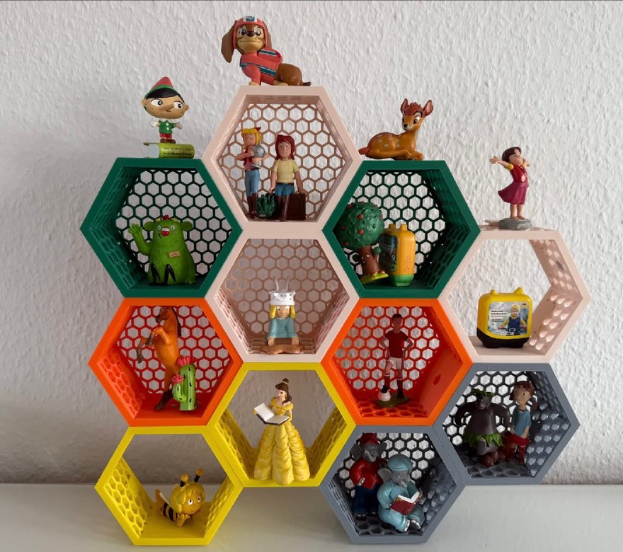 Renkli altıgen bloklardan oluşan raflar, küçük figür ve oyuncaklar için uygundur. Her raf farklı canlı renkte, düzenli ve eğlenceli bir alan yaratır. Ürün renksiz olarak basılır