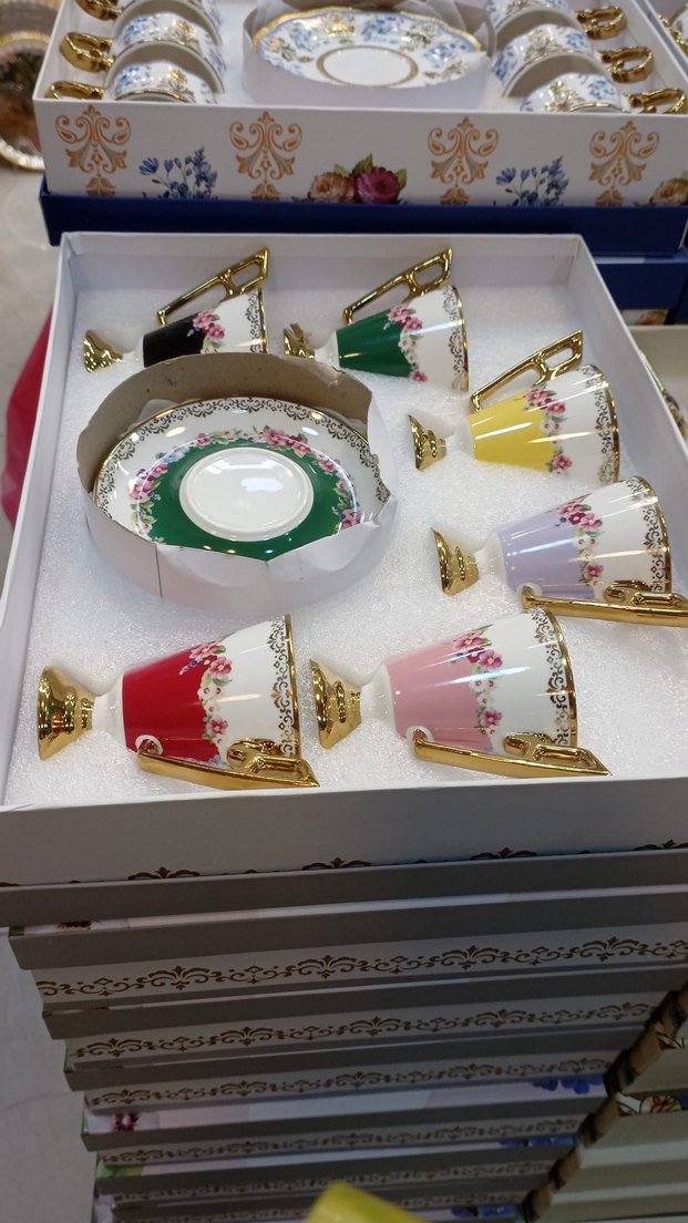 Altın saplı, çiçek desenli renkli porselen fincanlar ve uyumlu tabaklardan oluşan set. Şık kahve anları için ideal. Sipariş üzerine getiriyoruz ☕