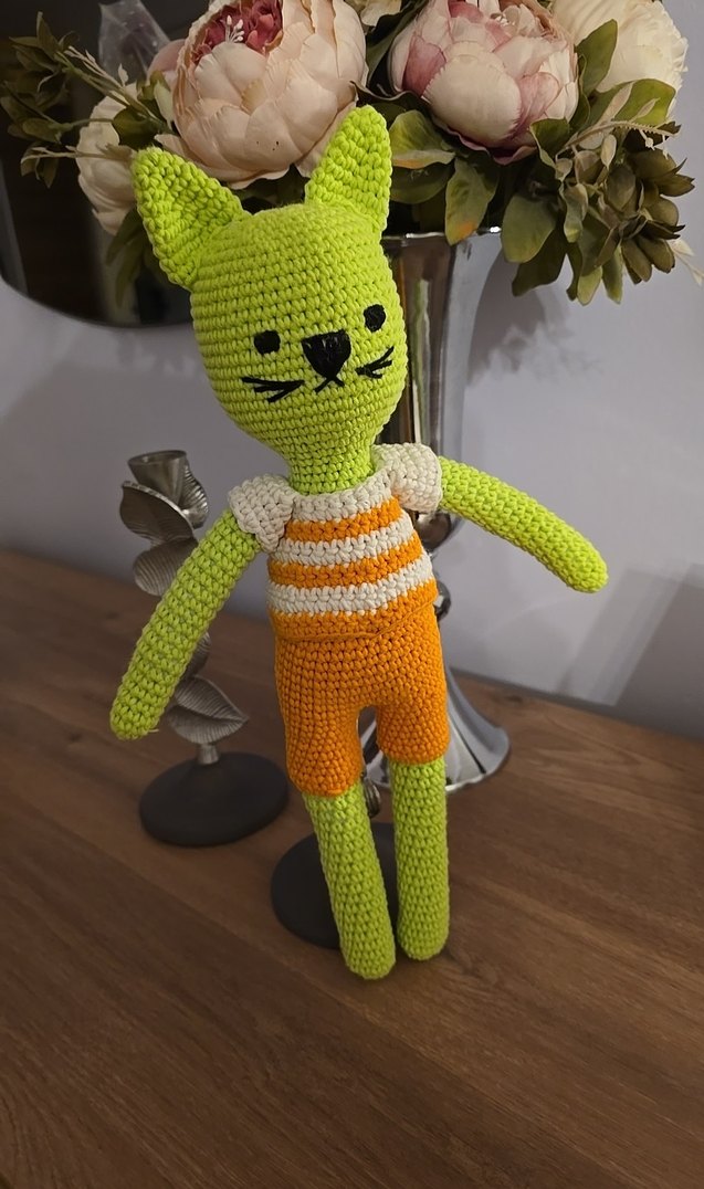 Çizgili tişörtlü, yumuşak ve el yapımı renkli 37 cm amigurami kedi oyuncak.