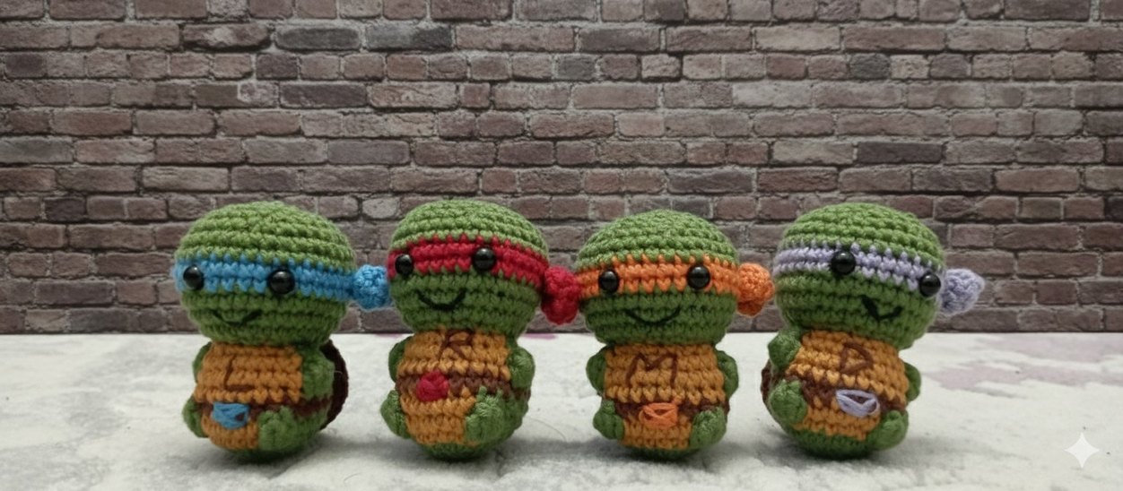 Yumuşak dokulu, renkli amigurumi ninja kaplumbağa peluş oyuncaklar. Sevimli yüz ifadeleriyle koleksiyon veya dekor için uygun.