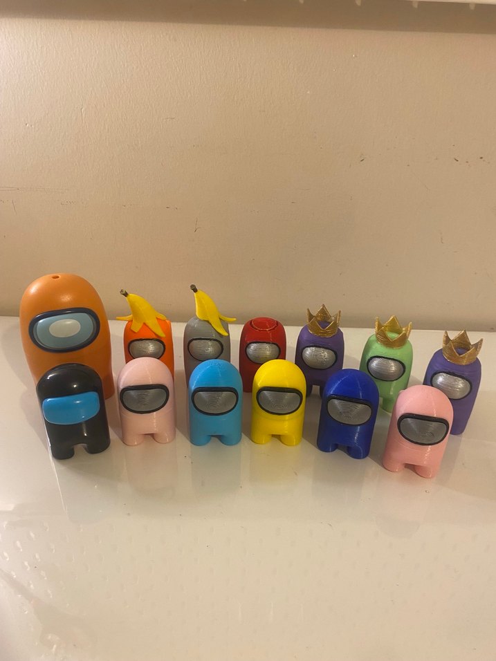 Farklı şapka ve aksesuarlarla çeşitli renklerde renkli Among Us aksiyon figürleri. Canlı bir koleksiyon. Among us 13 adet figür görselde görüldüğü gibi muz kafaların ufak deformasyonu var kırmızı olanın elması yok büyük turuncu ve siyah orjinal diğer 11 tanesi 3D yazıcı ile yapılmıştır boyu 6 cm civarındadır.