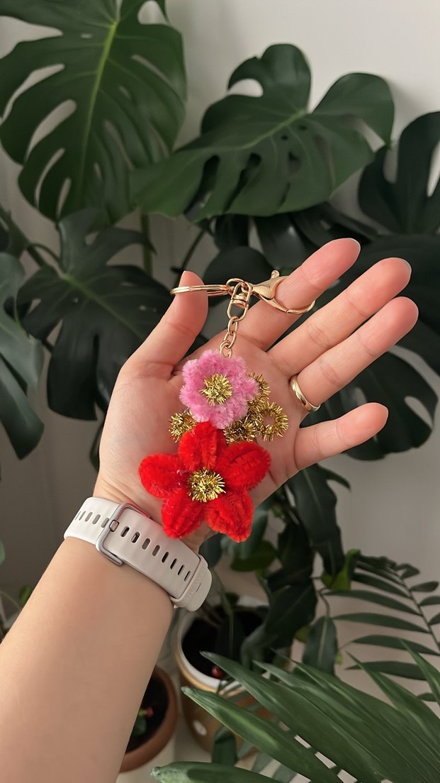 Kırmızı ve pembe çiçek püsküllerle süslenmiş renkli el yapımı anahtarlık