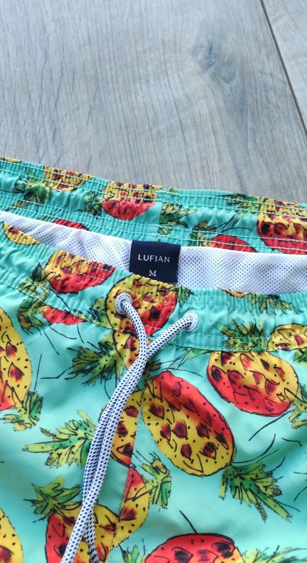 Renkli ananas desenli, fileli ve cepli erkek mini mayo, bohem tarzı ve plaj kullanımı için uygun.