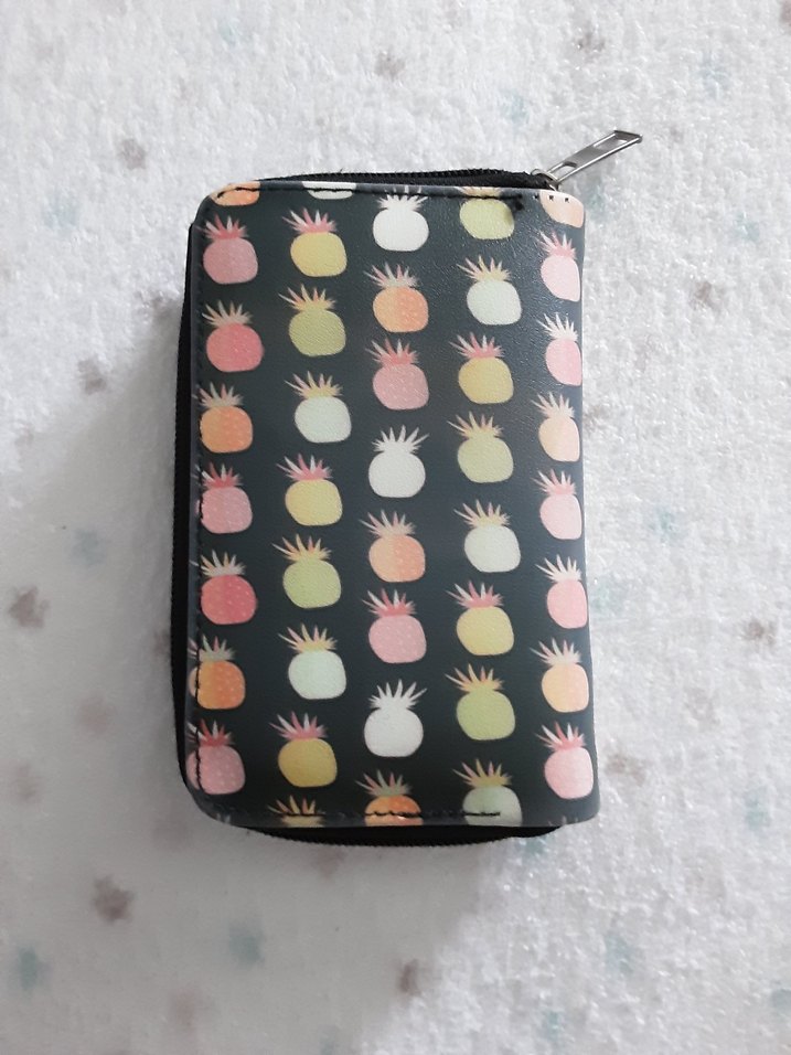 Renkli ananas desenli, fermuarlı kadın cüzdanı. Pürüzsüz sentetik kumaştan yapılmıştır, minimal ve bohem tarzlara uygundur. herhangi bir yerinde kusuru yok